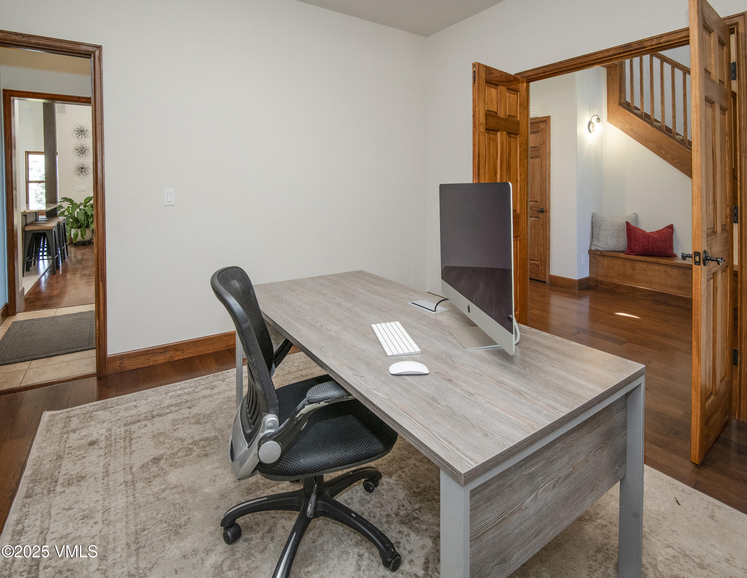 A dedicated dining area just off the kitchen opens to a covered deck and a serene, private backyard, ideal for outdoor entertaining or quiet relaxation. The main floor primary suite boasts an ensuite bath and an office, providing comfort and convenience.